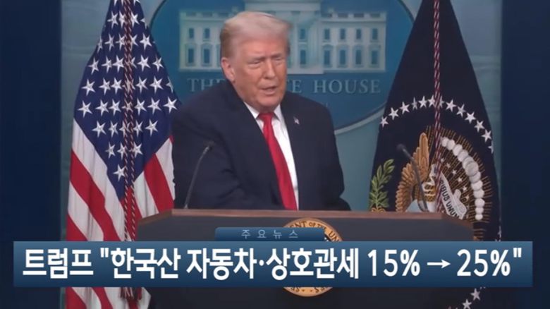 도널드 트럼프 미국 대통령이 "한국산 자동차 및 상호관세를 15%에서 25%로 인상한다"고 말했습니다.
