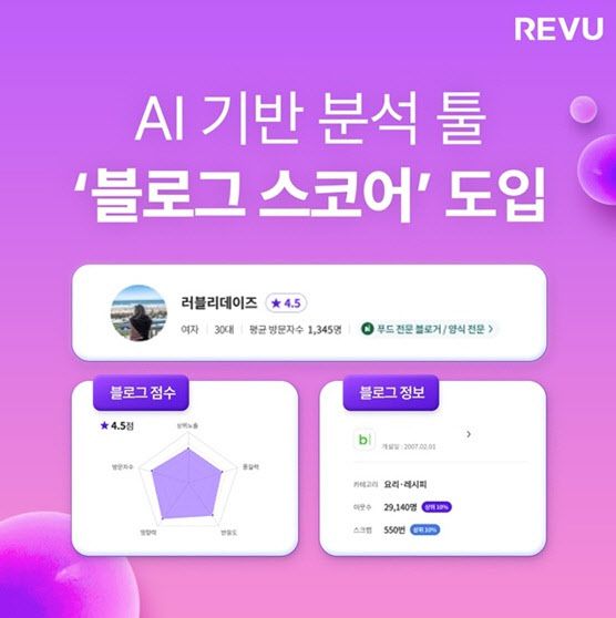 [이데일리 이윤정 기자] 글로벌 인플루언서 마케팅 플랫폼 기업 레뷰코퍼레이션(이하 레뷰)는 블로그의 영향력과 콘텐츠 경쟁력을 종합적으로 평가하는 AI 기반 지표 ‘블로그 스코어’를 새롭게 도입했다고 27일 밝혔다. 이번 기능 업데이트를 통해 레뷰는 인플루언서 마케팅 과정에서 보다 객관적이고 신뢰도 높은 데이터 기반 선정 환경을 강화했다.