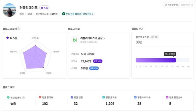 레뷰가 도입한 블로그 스코어는 단순 방문자 수나 게시글 수 중심의 기존 평가 방식에서 벗어나 △검색 노출 경쟁력 △콘텐츠 품질 △활동성 △이용자 반응 지표 등을 종합 분석해 수치화한 지표다. 실제 검색 결과 상위 노출 비율과 포스트별 반응 데이터를 함께 반영해, 광고 메시지가 소비자에게 도달할 가능성이 높은 블로그를 선별하는 것이 특징이다.
