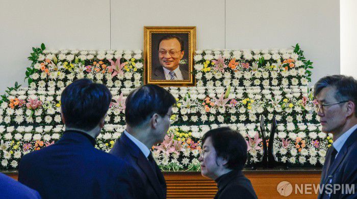 서울대병원 장례식장 특1호실에 마련된 빈소에는 이재명 대통령과 문 전 대통령의 조화뿐 아니라 이재용 삼성전자 회장, 김승연 한화그룹 회장, 서정진 셀트리온 회장 등 재계 인사들의 조화도 놓였다.