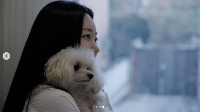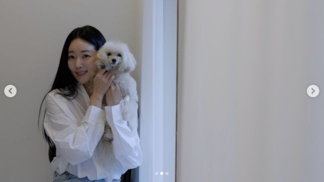 공개된 사진에는 반려견을 안고 벽에 기대어 포즈를 취하고 있는 김사랑의 모습이 담겨 있었다. 김사랑은 트레이드마크인 긴생머리 스타일과 청바지에 흰색 셔츠를 입고 청순한 분위기를 연출했다.