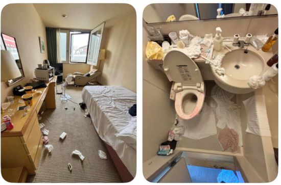 사진 속 객실은 정리되지 않은 수건, 빈 컵라면 용기, 음료수병, 사용한 티슈 등으로 엉망이 된 모습이다. 욕실에도 사용한 휴지와 수건 등 여러 물품이 널브러져 있다.