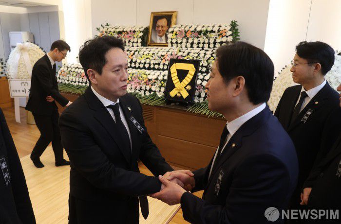 [서울=뉴스핌] 사진공동취재단 = 임태훈 군인권센터 소장이 27일 오후 서울 종로구 서울대학교병원 장례식장에 마련된 고(故) 이해찬 민주평화통일자문회의 수석부의장의 빈소를 찾아 조문하며 황명선 더불어민주당 의원을 위로하고 있다. <2026> 2026.01.27 photo@newspim.com
