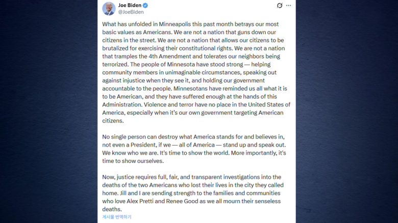 바이든 전 대통령은 현지 시간 27일 엑스에 올린 글에서 "지난 한 달 동안 미니애폴리스에서 벌어진 일은 미국인으로서 우리의 가장 기본적 가치를 배반하는 것"이라고 목소리를 높였습니다.