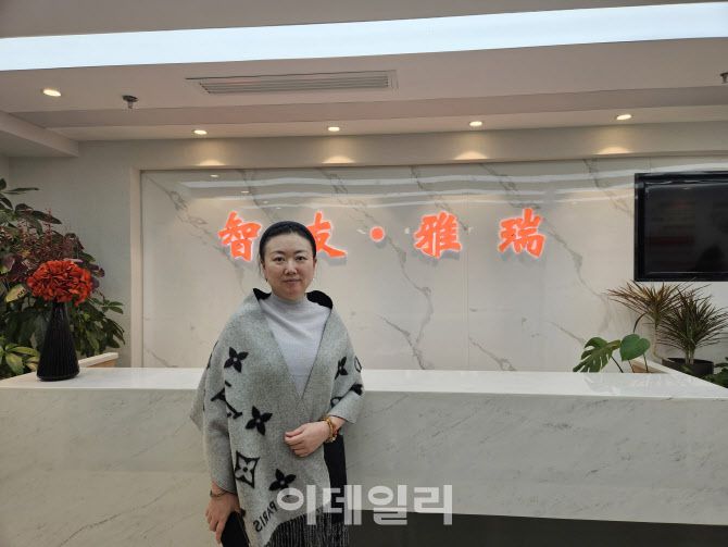 잉위페이 베이징즈유연구원 부원장이 베이징 본사 사무실 앞에서 포즈를 취하고 있다. (사진=이데일리 이명철 특파원)