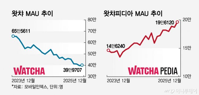 관건은 왓챠피디아가 어떤 평가를 받는지다. 25년간 운영되며 축적한 수억개의 평점은 알고리즘 고도화, AI 학습 등에 쓰일 수 있어서다. 왓챠피디아의 2025년 12월 MAU(월간 활성 이용자 수·20만명)는 2023년 12월(15만명) 대비 34.1% 증가했다. 반면 OTT 왓챠 MAU는 같은 기간 66만명에서 40만명으로 39% 감소했다.