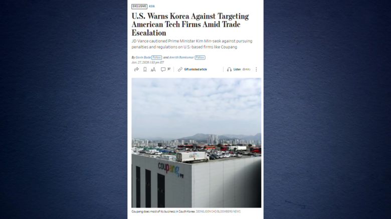 월스트리트저널은 현지 시간 27일 관계자들을 인용해 "밴스 부통령이 지난주 워싱턴에서 김 총리와 만나 쿠팡을 포함한 미국 기술기업들에 불이익을 주는 조치를 하지 말 것을 경고했다"고 보도했습니다.