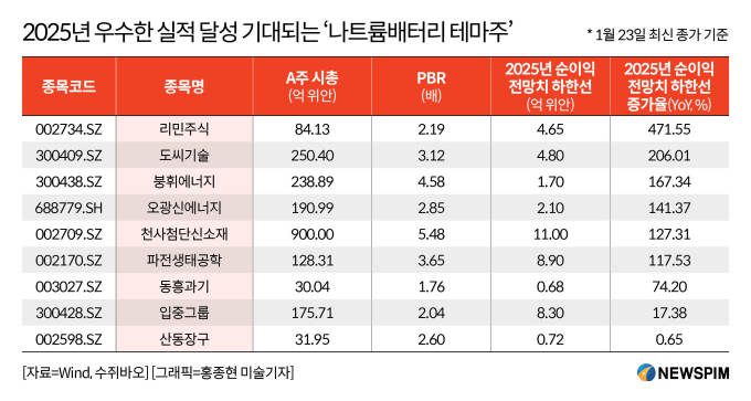 최근 공개된 실적 데이터에 따르면(순이익 전망치가 구간이면 하한선 기준, 하한선이 없으면 공시된 수치 적용), 2025년 순이익이 전년 대비 증가(흑자전환 포함)한 나트륨이온전지 테마주는 9개로 집계됐다.