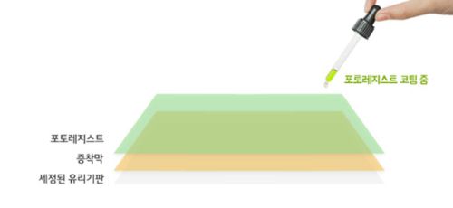 증착을 마친 유리 기판 위의 이물질을 제거하기 위해 다시 한번 세정해줍니다. 그리고 그 위에 포토 레지스트(Photo Resist·PR)를 코팅해줍니다. 이 과정이 ‘모양 만들기 프로젝트’의 핵심인데요. ‘빛에 반응하는 감광성 고분자 물질’을 뜻하는 PR를 활용하면 빛을 받는 부분과 그렇지 않은 부분을 선택적으로 제거할 수 있습니다.