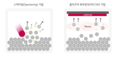 금속 재료이면 스퍼터링(Sputtering) 기법을, 반도체나 절연막은 플라스마 화학 증착(Plasma Enhanced Chemical Vapor De position·PECVD) 기법을 각각 이용합니다.