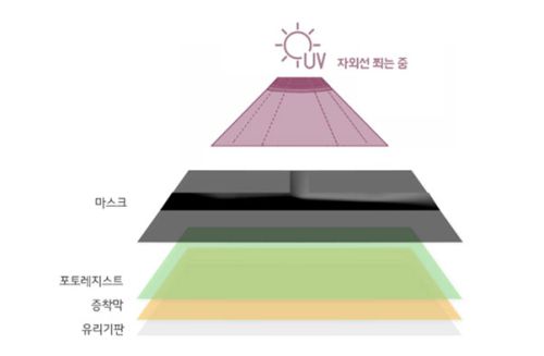 이번엔 원하는 패턴 모양의 마스크를 씌운 뒤 에너지가 높은 자외선(UV)을 7~8초간 쬐어줍니다. 이때 마스크가 빛을 통과하지 못하게 막는 가림막의 역할을 하게 되는데요. 그러면 패턴 부분을 통해 빛을 받는 부분과 받지 않는 부분이 나눠지겠죠? 이 과정을 노광이라 부릅니다.