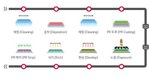 마지막으로 이상 유무를 판단하기 위해 검사까지 완료하면 1회의 TFT 패턴 공정이 완료되는 것이죠. 과거에는 트랜지스터를 만들기 위해 이 전체 과정을 8번이나 반복했다고 합니다. 그러나 지금은 기술 개발을 통해 2~3층을 한번에 만들 수 있게 되어 4번의 과정만으로도 충분히 만들 수 있지요.