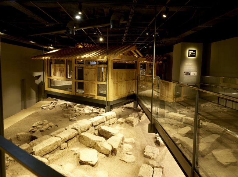 전시관 안쪽에 자리한 이문안길 작은 집 구역의 모습이다. 아래 바닥에 온돌과 마루, 아궁이 등이 드러난 조선 전기 한옥터가 있고, 위쪽 유리 데크 위에 터의 한옥집을 복원했다. 서울역사박물관 제공 |
