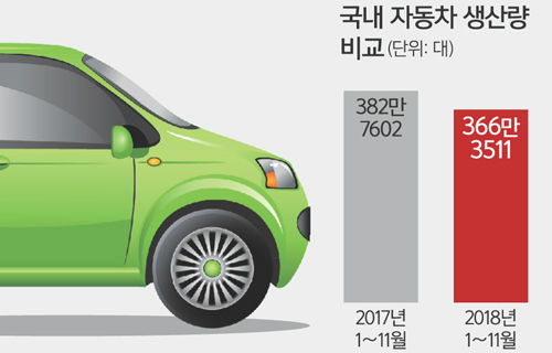 산업통상자원부 자료에 따르면 올해 1∼11월 내수·수출을 포함한 국내 차 판매량은 364만2645대로 전년 동기(377만8362대) 대비 3.6% 줄어든 것으로 나타났다. 차 부품업체에 직접 영향을 미치는 생산량은 이보다 더 큰 폭으로 감소했다. 올해 1∼11월 차 생산량은 366만3511대로 전년 동기(382만7602대) 대비 4.3% 줄었다.