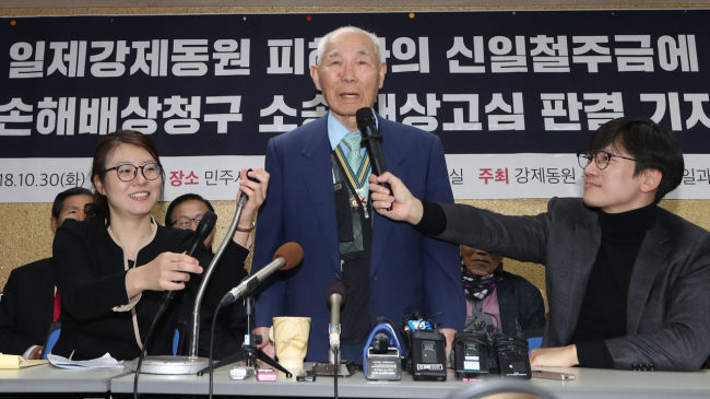 ⑥대법원, 日 강제징용 피해자 손해배상 판결=대법원은 지난 10월 일제 강제징용 피해자 여운택 씨 등 4명이 일본 기업 신일철주금을 상대로 낸 손해배상 소송 재상고심에서 원고 일부 승소 판결한 원심을 확정했다. 이번 판결로 여 씨 등은 신일철주금에 각 1억원의 위자료를 청구할 수 있게 됐다. 일본은 그동안 1965년 한일 청구권협정이 체결돼 피해자들에게 배상할 의무가 없다고 주장했다. 하지만 대법원은 청구권협정을 국가 간 조약이라며 개인은 별개로 피해 배상을 청구할 수 있다고 최종 판단했다. 지연된 정의라는 평가가 나왔다. 법원에 소송을 낸 지 13년 만의 판결이었다. 원고 4명 중 여 씨를 포함한 3명은 이미 세상을 떠났고, 올해 94세인 이춘식 씨만이 이날 판결을 지켜봤다. 지난달 법원은 미쓰비시중공업도 강제징용ㆍ근로정신대 피해자들에게 배상금을 지급하라는 판결을 내렸다.