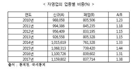 자영업은 매년 80만명의 개인사업자가 폐업하고 100만명이 신규로 진입하고 있으며 폐업 후 재창업하는 회전문 형태를 보이고 있다. 보고서는 2014년 이후 신규 자영업자가 100만명을 넘어 과당경쟁이 심화되고 있는 상황이라고 지적했다.