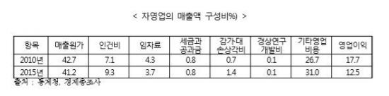 자영업의 비용 구조는 열악했다. 자영업(종사자수 5인 미만)의 매출액 구성비를 살펴 보면 2015년의 경우 매출원가가 41.21%, 기타영업비용이 31.0%, 인건비가 9.3%로 나타났다. 2010년과 비교해 보면 인건비, 기타 영업비용의 비중이 증가했고 임차료의 비중은 낮아졌다. 영업이익의 비중도 5%p 줄었다.