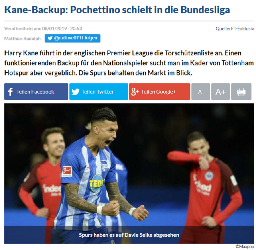 축구 전문 매체 8일(현지 시간) 'FUSSBALL'은 이적 시장을 다루는 코너에서 "토트넘이 케인의 백업 공격수를 찾고 있다. 젤케에게 관심을 두고 있다. 지난여름 토트넘은 선수 영입을 한 명도 하지 않았다"면서 "하지만 마우리시오 포체티노 감독은 페르난도 요렌테, 빈센트 얀센 둘 모두에게 만족하지 못하고 있다"고 했다.