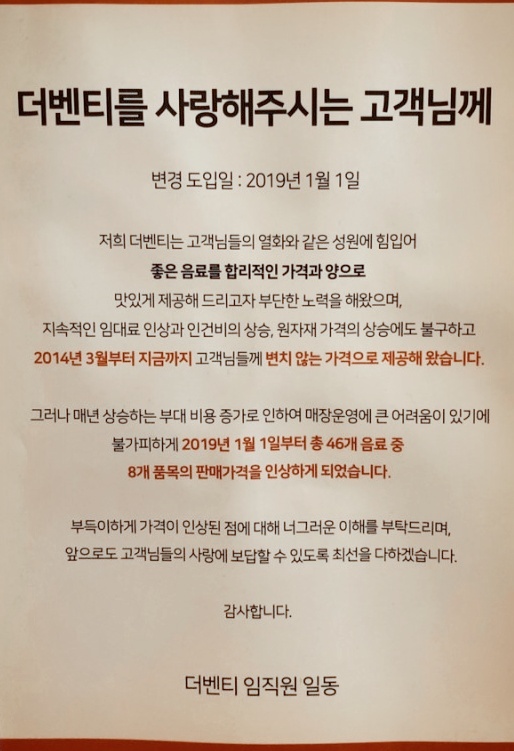 인근 커피전문점 ‘더 벤티’에도 ‘지속적인 임대료 인상과 인건비 상승 등으로 매장에 큰 어려움이 있어 8개 품목의 가격을 인상하게 됐다’고 써 놨다. 이번 인상 결정에 따라 더 벤티 아이스 아메리카노는 1500원에서 1800원으로 올랐다. 두끼 관계자는 “론칭 당시의 저렴한 가격을 유지하기 위해 애썼지만 인건비 상승 등으로 부대비용이 증가해 부득이하게 가격을 올렸다”고 설명했다.