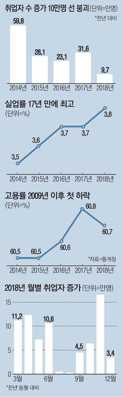 ![9일 오전 서울 aT센터에서 열린 2019년 공공기관 채용정보 박람회장이 학생과 구직자들로 북적였다. 이날 통계청은 지난해 취업자 증가 폭이 금융위기 이후 최소치를 기록했다고 밝혔다. [이충우 기자]](http://static.news.zumst.com/images/18/2019/01/09/9c6f0ecc139741fe9d83748c369d9346.jpg)
