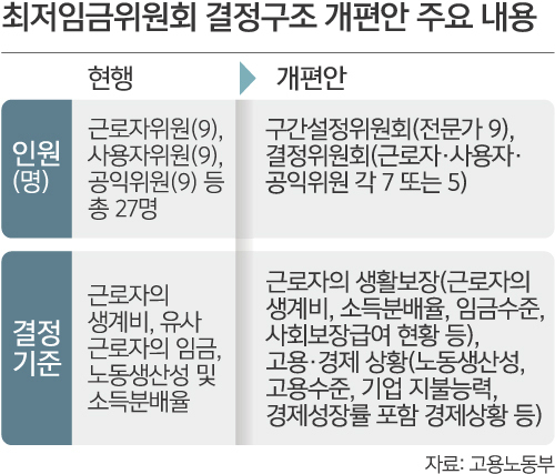 현행 최저임금 결정체계는 노동계를 대표하는 근로자위원 9명, 경영계를 대표하는 사용자위원 9명, 공익위원 9명 등 27명으로 구성된 최저임금위원회가 최저임금을 의결하는 방식인데 노·사간 극심한 대립으로 파행이 잦았던 게 사실입니다.