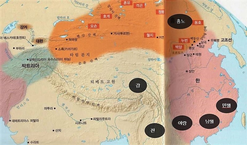 기원전 3세기로 시점을 고정시키고, 중국 동북지방과 한반도 서북에 걸쳐 있던 고조선에서 시작하여 시계 반대 방향으로 돌아가면 우선 흉노가 나타난다. 흉노에서 다시 서남쪽으로 돌아가면 월지, 오손, 강거가 등장하는데, 지금의 카자흐스탄과 키르기스스탄, 우즈베키스탄 땅이 이들의 활동무대였다. 계속 시계 반대 방향으로 돌아서 현재의 티베트로 가면 강(羌), 윈난(운남)성으로 가면 전(?), 구이저우(귀주)성으로 가면 야랑(夜郞), 광둥(광동)성으로 가면 남월, 푸젠(복건)성으로 가면 민월(?越)이 나타난다. 이렇게 수많은 세력이 한을 둘러싸고 때로는 평화적으로, 때로는 긴장 속에서 복잡한 상호 관계를 맺어 나갔다. 한국사를 동북아시아의 범주에 가두면 당시의 역사는 한나라와 고조선의 관계만으로 축소되며 이렇게 다양한 집단의 움직임은 눈에 들어오지 않는다. 유라시아적인 시각에서 한국사를 보아야 하는 이유가 여기에 있다.