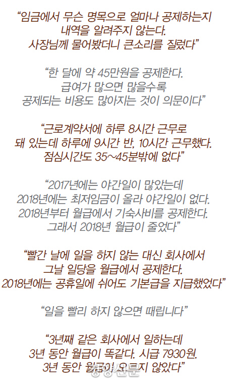 휴식시간을 단축해 노동시간을 늘리는 편법도 사용됐다. 캄보디아에서 온 제조업 노동자 D씨는 “하루 8시간 일하면 1시간 쉬는 시간 준다고 했는데 쉬는 시간은 점심시간 20분밖에 없다”고 했다.