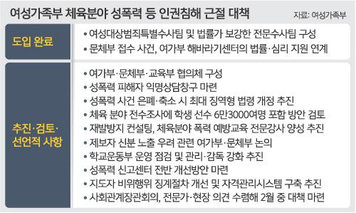 여가부·교육부·문체부 협의한 근절책 실효성 논란 / 협회 등 성폭력 은폐 때 징역형? / 법 개정 필요… 국회 통과 ‘요원’ / 학생 선수 6만3000명 전수조사? / 검토사안으로 분류 실현 미지수 / 10여개 방안 중 2개만 당장 가능 / 시민단체 “피해자 보호대책 시급”