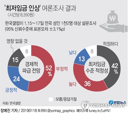 (서울=연합뉴스) 고상민 기자 = 국민의 절반 이상은 올해 최저임금 인상(시간당 8천350원)이 경제에 부정적 영향을 미칠 것으로 내다본다는 여론조사 결과가 18일 나왔다.