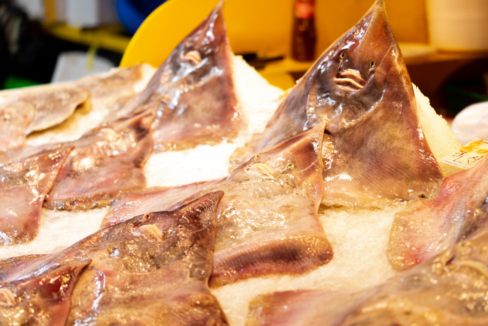 흔히 어시장은 횟감을 즐기러 가는 곳으로 생각한다. 서울에 있는 노량진수산시장, 강서수산물시장, 가락동수산물시장만 하더라도 회를 먹을 수 있는 곳들이 성업 중이다. 인천종합어시장(이하 어시장)에도 횟감 파는 곳이 있다. 여기서 꼭 맛봐야 하는 횟감이 있다. 코를 쏘는 냄새로 잘 알려진 어종이다. 코를 쏜다? 혹시 홍어? 어시장 내에 활어를 파는 곳과 마주 보며 홍어를 파는 집이 몇 집 있다. 홍어 하면 전라남도 신안군 흑산도나 나주 영산포를 생각한다. 홍어는 서해를 회유하는 어종, 인천에서 뱃길로 두 시간 가는 대청도에서도 많이 잡히지만 잘 알려지지는 않았다.