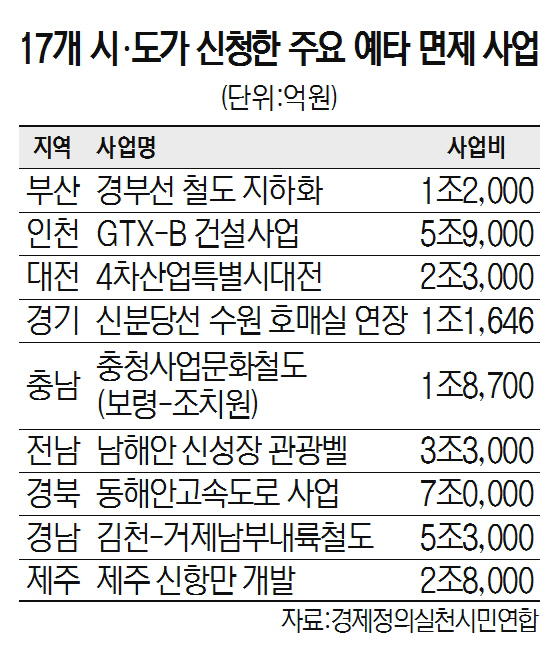 이에 더해 정부는 오는 29일 국무회의 후 전국적으로 예타 면제 사업과 그 기준을 발표할 예정입니다. 각 광역시·도가 수십여개, 수십조원의 사업의 예타 면제를 신청했는데, 이 중에 받아들일 것이 무엇인지 발표하는 것입니다. 문 대통령은 신년 기자회견에서 “아주 엄격한 선정 기준을 세워서 광역별로 한 건 정도의 공공 인프라 사업들은 우선순위를 정해서 (예타 면제 대상으로) 선정해야 하지 않을까 생각하고 있다”고 말했는데, 그 후속조치인 격이지요. 문 대통령은 예타 면제 사업을 선정하는 이유에 대해 “서울이나 수도권은 (예타가) 쉽게 통과되는데 지역은 인구가 적어 통과하는 데 어려움을 겪고 있다”고 설명했습니다. 실제 국가재정법을 봐도 “지역 균형발전을 위해 필요한 사업으로, 국무회의를 거쳐 확정된 것은 예타를 면제할 수 있다”고 돼 있어 정부는 이를 근거로 사안을 추진하고 있습니다.
