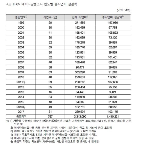 타당성 유무를 기준으로 할 경우 예타를 통해 약 141조원의 예산이 절감된 것으로 집계됐다.