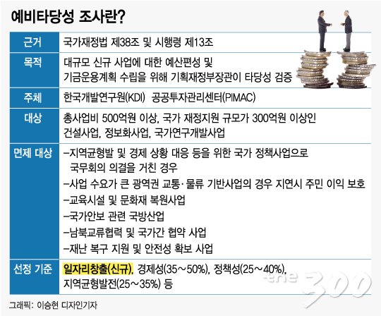 예외 조항도 있다. 사업 수요가 큰 광역권 교통·물류 기반사업 등 타당성 조사로 시간이 지연돼 정책효과가 반감되거나 주민 편익이 훼손될 우려가 있을 경우 예타를 면제한다. 지역균형발전이나 긴급한 경제·사회적 상황 대응을 위해 국가 정책적으로 추진이 필요한 사업인 경우, 국가 정책을 위해 국무회의를 거쳐 확정된 사업도 예타 대상에서 제외 가능하다.
