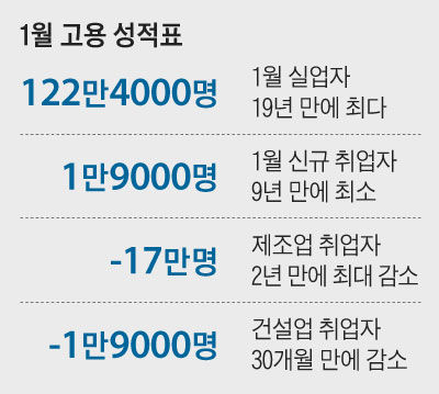 고용 상황은 최악으로 치닫고 있다. 지난 1월 실업자가 122만명을 넘어 19년 만에 최대로 치솟았다. 통계청이 13일 발표한 1월 고용 동향에 따르면 지난달 실업자는 1년 전보다 20만4000명 증가한 122만4000명에 달했다. 1월 기준으로 외환 위기 당시인 2000년 1월(123만2000명) 이후 최대다. 실업률도 4.5%까지 올라 1월 기준으로는 2010년 이후 9년 만에 가장 높았다. 일자리가 늘지 않고 있기 때문이다. 전체 취업자 수는 2623만2000명으로 지난해 같은 기간에 비해 고작 1만9000명 늘었다. 같은 기간 15세 이상 인구가 24만6000명 증가한 것을 감안하면 새 일자리가 15만개는 생겨야 고용률(65.9%)이 현상 유지라도 할 수 있는데 턱없이 모자란 수준이다. 정부가 세금으로 만드는 보건업·사회복지 서비스업과 정보통신업 등 일부 업종을 제외하고는 대부분 업종에서 일자리가 사라지고 있다. 특히 전체 고용의 4분의 1을 담당하는 제조업과 건설업에서도 일자리 감소가 나타나면서 일자리의 근간이 무너지는 것 아니냐는 우려가 나온다.