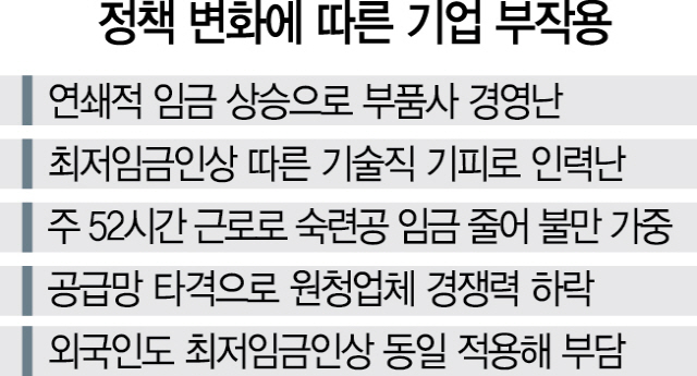 재계의 한 관계자는 “각종 정책이 산업생태계를 더 허약하게 만들고 있다”며 “특히 고령의 숙련공들이 대체인력도 없는 마당에 산업현장을 떠나고 있어 우려스럽다”고 말했다.