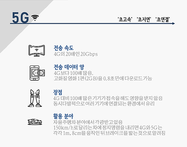 전송 데이터 양: 4G보다 100배 많음. 고화질 영화 1편(2GB)을 0.8초 만에 다운로드 가능