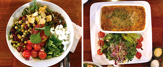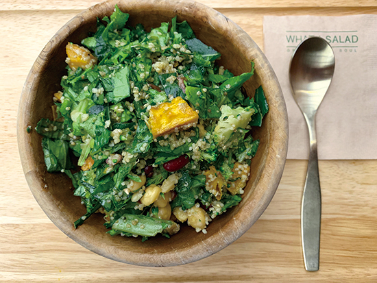 재미있는 채식 식당이다. 이 집은 채식주의자들의 여러 단계 중 일부를 수용하는 포괄적 비건 식당이다. 물론 베이스는 로메인, 시금치, 케일, 계절 채소 등 야채와 콩류이다. 거기에 치킨이나 연어가 들어갈 수도, 그렇지 않을 수도 있다. 왓어샐러드(채소들과 치킨, 계란 1만3200원), 붉은귀리(채소들과 치킨, 그라나파다노 치즈 1만600원), 노르웨이 오메가(채소들과 그라브락스 숙성 연어 1만4800원), 리프레쉬림프(채소들과 로스트 쉬림프 1만4100원) 등이 유명하다. 손님이 세세한 재료까지 선택할 수 있는 체크리스트 주문서도 재미있다. 샐러드 사이즈(레귤러와 점보), 기본 토핑(4가지 기본, 토마토, 파프리카, 적양파, 브로콜리, 당근 등 23가지 모두 선택할 수도), 프리미엄 토핑(아보카도, 구운두부, 스파이시치킨, 연어 등 12가지), 드레싱(클래식 시저, 클래식 발사믹 등 12가지) 등이 체크 리스트이다. 한 그릇만 먹어도 배가 엄청 부르다.