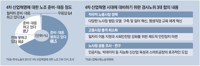 한국도 최근 들어 이 같은 '4차 노동혁명' 논의를 본격화해 경사노위 산하 '디지털 전환과 노동의 미래위원회'는 이날 전병유 위원장(한신대 교수) 주재 기자회견을 열고 디지털 전환에 대한 노사정의 기본 인식과 정책에 관한 기본합의문을 발표했다. 디지털 전환에 대비한 다양한 노사정 협업 모델 구축과 평생직업 교육체계 혁신, 고용시장 충격을 최소화하기 위한 일자리 이동 지원, AI와 빅데이터 등 지능화 신산업 육성과 스마트공장의 효과적 도입을 위한 융합적 공동조사·연구 체계 마련 등을 골자로 한다. 산업 간 융합과 플랫폼 경제 같은 신산업 출현에 따른 사회적 갈등을 완충하는 장치를 미리 마련해 현대판 러다이트운동(1811∼1817년 영국 중북부 직물공업지대에서 일어났던 기계 파괴운동)을 방지하자는 취지다.