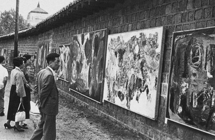 1960년 10월 ‘60년미술협회’ 동인들이 덕수궁 북쪽 벽에서 열었던 ‘벽전’의 전시 모습. |