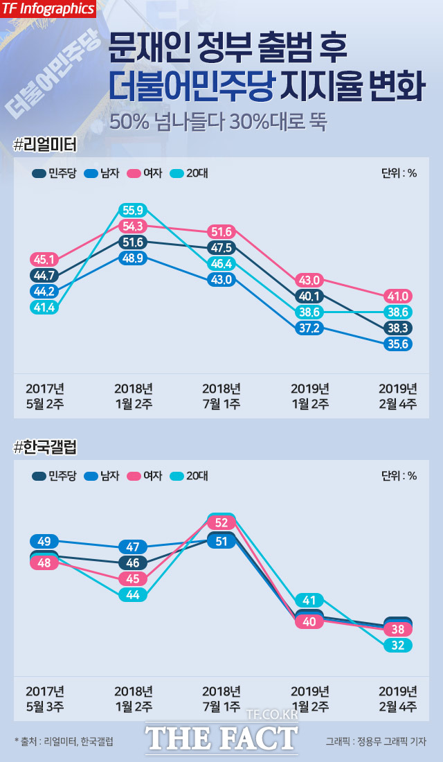 문재인 정권 출범 직후인 2017년 5월 3주 리얼미터 주간집계를 보면 민주당 지지율은 53.3%였다. 특히 20대 지지율은 61.4%로 지금까지도 민주당의 든든한 우군인 30대(59.2%)보다도 높았다. 남녀 지지율은 각각 51.7%와 54.9%였다(전국 성인남녀 2526명 대상, 표본오차 95% 신뢰수준에 ±1.9%포인트).