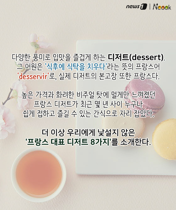 (서울=뉴스1) 박라경 에디터 = 다양한 풍미로 입맛을 즐겁게 하는 디저트(dessert). 그 어원은 '식후에 식탁을 치우다'라는 뜻의 프랑스어 'desservir'로, 실제 디저트의 본고장 또한 프랑스다. 높은 가격과 화려한 비주얼 탓에 멀게만 느껴졌던 프랑스 디저트가 최근 몇 년 사이 누구나 쉽게 접하고 즐길 수 있는 간식으로 자리 잡았다. 더 이상 우리에게 낯설지 않은 '프랑스 대표 디저트 8가지'를 소개한다.