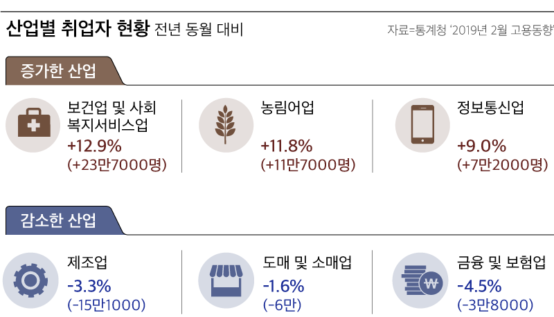 업종별로는 제조업에서 취업자가 15만명 급감했다. 사업시설관리·사업지원및임대서비스업(-2만9000명), 도매 및 소매업(-6만명) 등 서비스업 취업자 감소 추세도 지속됐다. 음식·숙박업(1000명)은 지난 2017년 12월 이후 14개월만에 증가세로 전환했다.