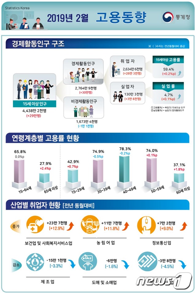 정동욱 통계청 고용동향과장은 "노인일자리 사업으로 보건업 및 사회복지서비스업에서의 취업자가 크게 늘었다"며 "연령별로도 60세 이상 취업자가 39만7000명 증가했다"고 설명했다.