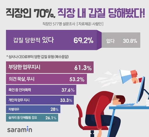 직장인 10명 중 7명은 ‘직장 내 갑질’을 당해 본 것으로 나타났다.