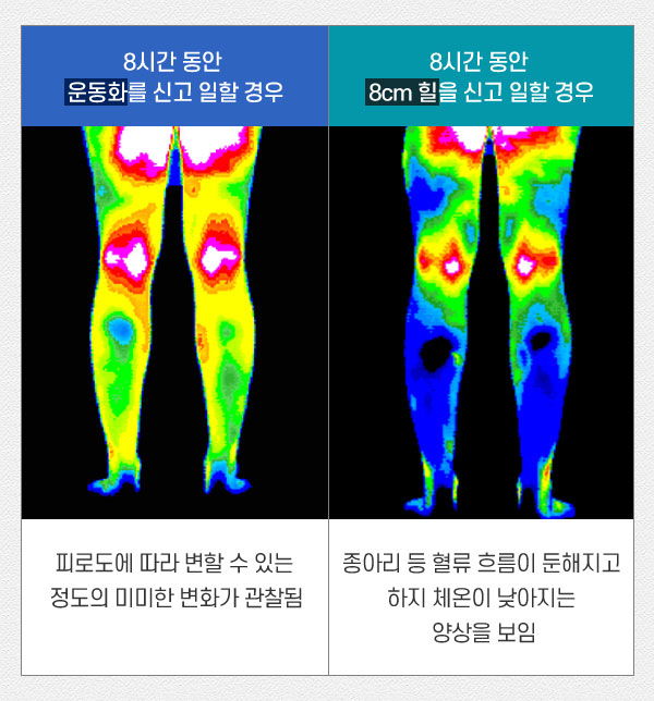 동일 인물이 운동화와 8cm 하이힐을 각각 8시간을 신고 일한 뒤, 하지 체열 변화를 측정해 비교했습니다. 운동화를 신었을 때는 정상 체열을 뜻하는 빨간색과 노란색이 주를 이루었지만, 하이힐을 신었을 때는 저체온을 뜻하는 파란색과 초록색을 주로 볼 수 있습니다. 이처럼 오랜 시간 하이힐을 신고 있으면 혈액 순환이 나빠지고, 하지 부종 등의 위험이 뒤따릅니다.