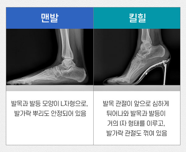 동일 인물이 맨발과 하이힐을 신은 후 엑스레이를 찍어 보았더니 하이힐을 신었을 때 발목과 전족부가 꺾이는 모습이 관찰됩니다. 발목 관절이 꺾이면서 주변부 인대가 늘어나고, 발 앞부분인 전족부의 관절이 탈구되면서 주변의 지방조직을 자극해 관절염을 일으킬 위험이 있습니다.