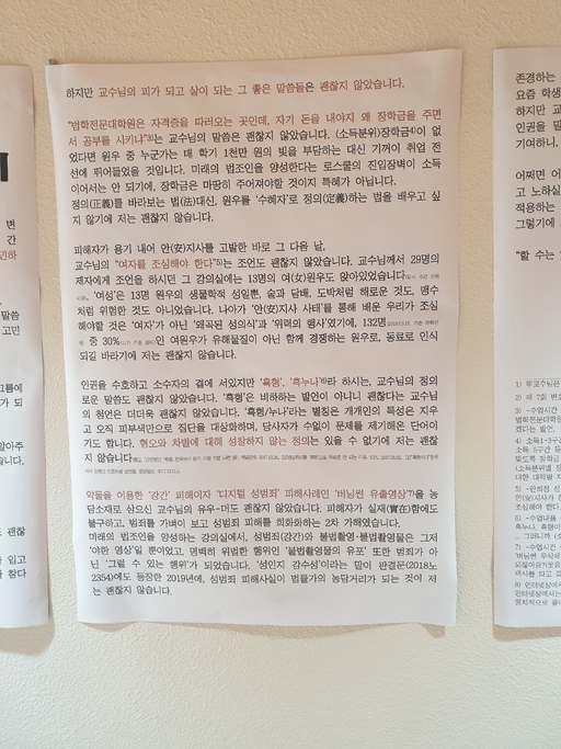 작성자는 “교수님의 조언과 농담이 정의·평등·인권을 말하는 교수님의 언사를 퇴색시키고, 혐오와 차별의 탑을 공고히 하는 데 기여하니 로스쿨에 대한 저의 ‘낭만’ 또한 부서졌다”고 말했다.