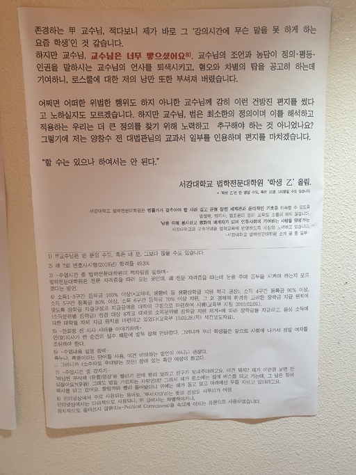 서강대 하비에르관 내 게시판에 게재된 ‘서강대 법학전문대학원 甲(갑) 교수님께 올리는 편지’ 대자보 |