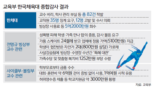 교육부, 한체대 종합감사 결과 / 조재범 폭행 피해 학생·가족 만나 / 진로 볼모삼아 회유·압박 등 병행 / 제자 사설강습팀 ‘특혜 대관’에 / 대한항공 감독에 취업청탁까지 / 볼링·생활무용·사이클 교수 등 / 타종목 금전 비리도 대거 적발