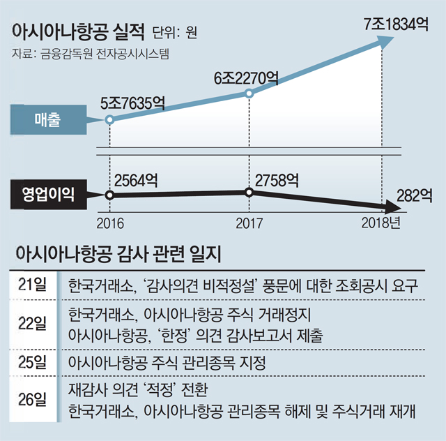 아시아나항공은 26일 지난해 재무제표에 대한 감사의견이 ‘한정’에서 ‘적정’으로 변경됐다고 공시했다. 함께 제출된 수정 재무제표에 따르면 연결기준 지난해 매출액은 7조1834억 원(전년 대비 +8.9%), 영업이익은 282억 원(전년 대비 ―88.5%), 당기순손실은 1959억 원(적자 전환)으로 나타났다. 당초 공시한 재무제표에 비해 이익은 크게 줄고, 손실 규모는 불어났다.